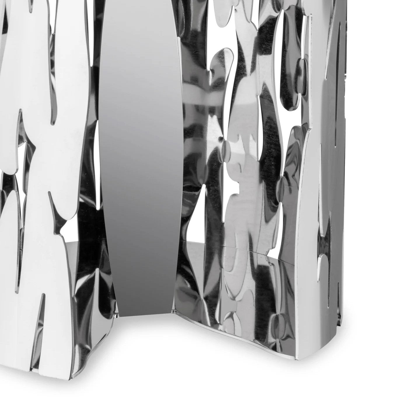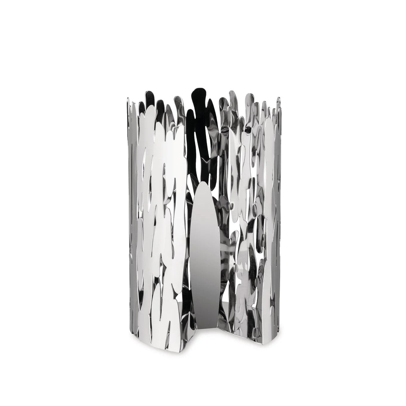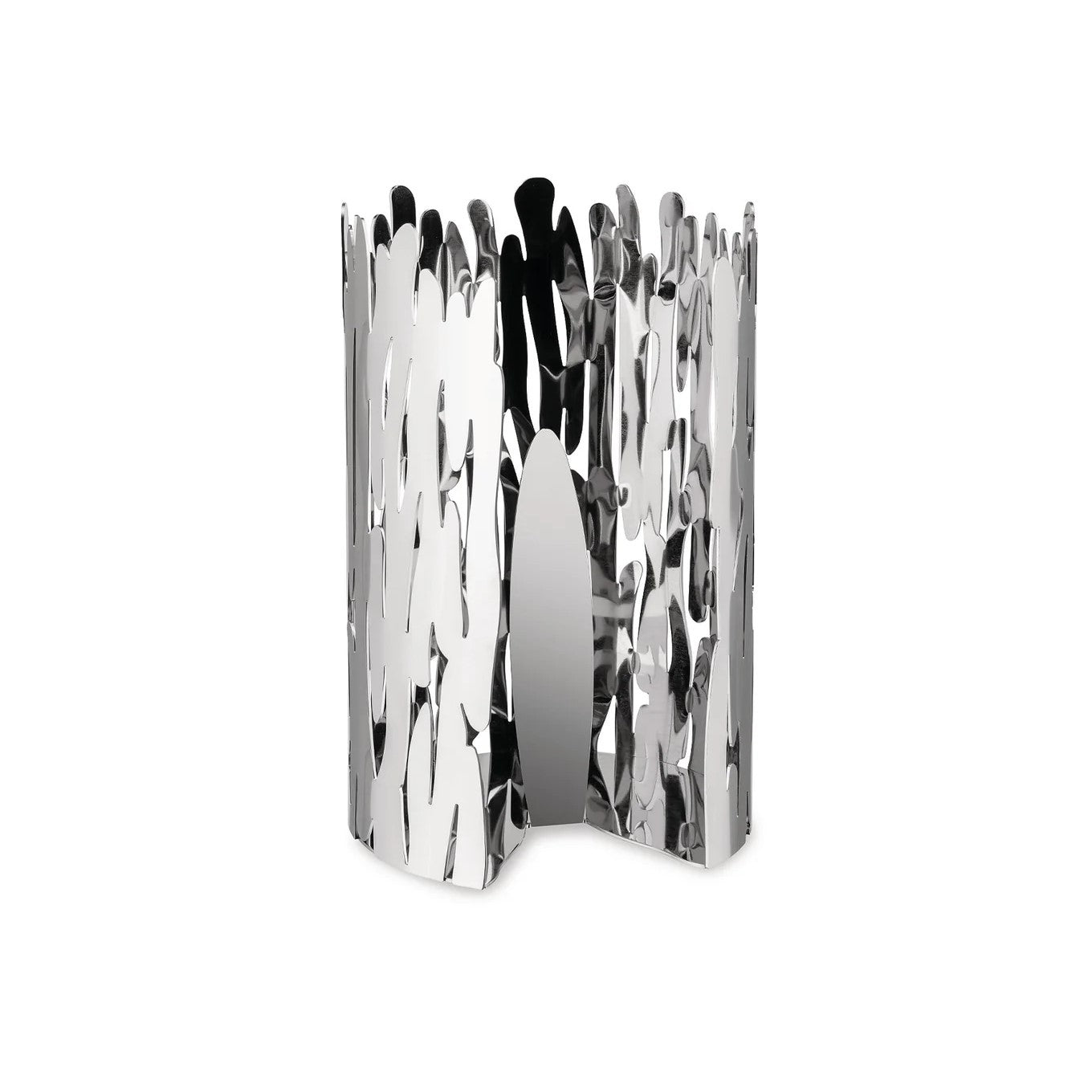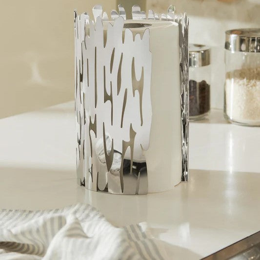 The roll holder "Barkroll" is produced at the factory in Crusinallo. Omegna, using a manufacturing process whereby the steel sheet is cut and laser perforated, and subsequently shaped with a series of mechanical processes, and lastly welded. This kitchen roll holder recalls the bark of a tree: the perforated pattern recalls the knots in wood grain, the cylindrical shape suggests the structure of the tree trunk. The result is a poetic yet functional object which, as its designers state, each time a sheet is torn off reminds the user that paper is made from trees.