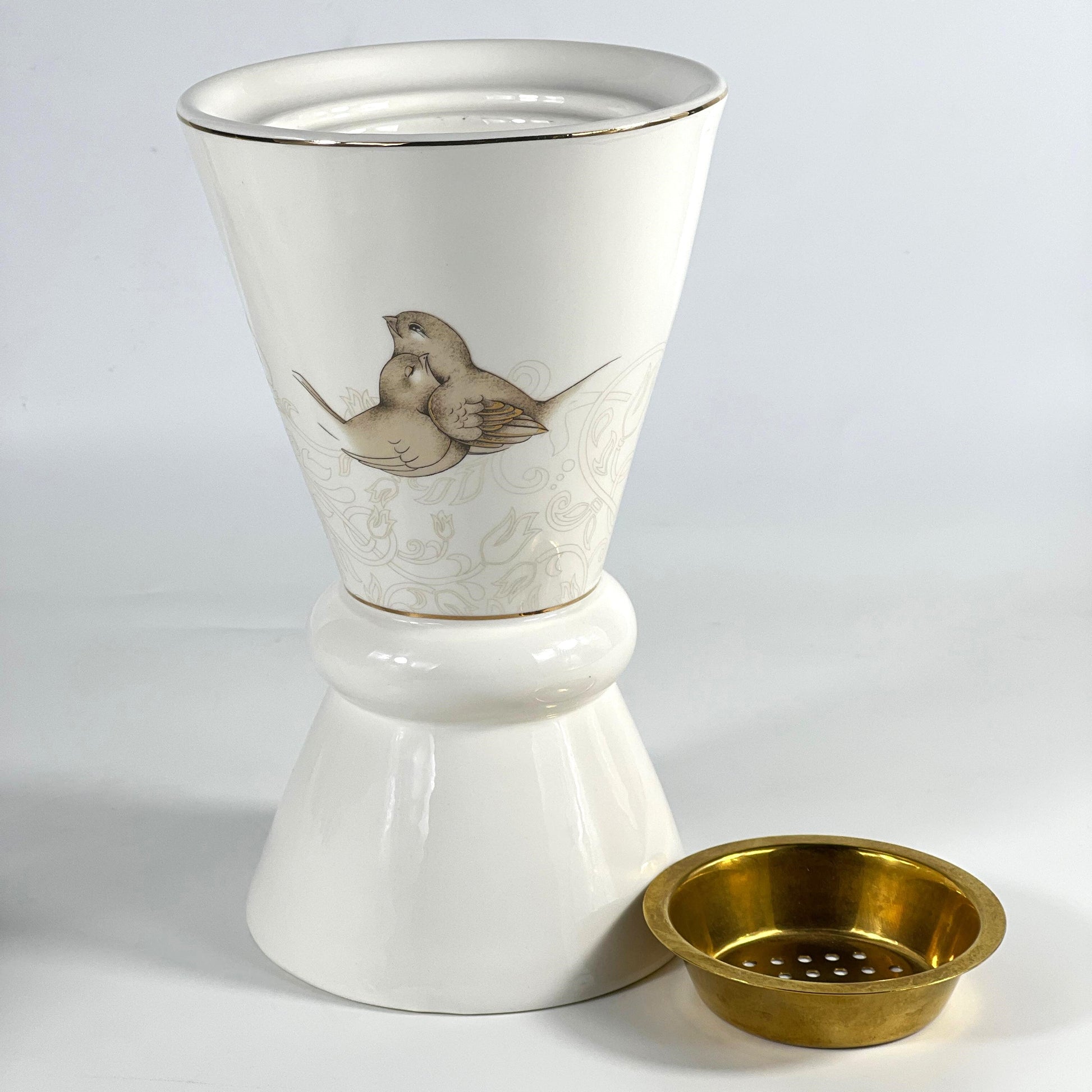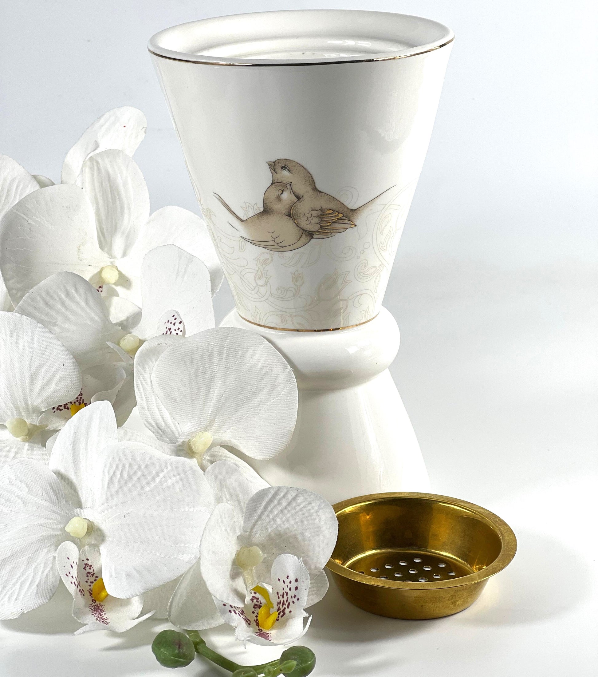 Bring charm and tradition into your space with the Bird Madkhan, a beautifully designed porcelain incense burner that merges cultural heritage with refined artistry. Adorned with delicate bird-inspired floral patterns in soft gray, this piece is both a spiritual accessory and a decorative statement.