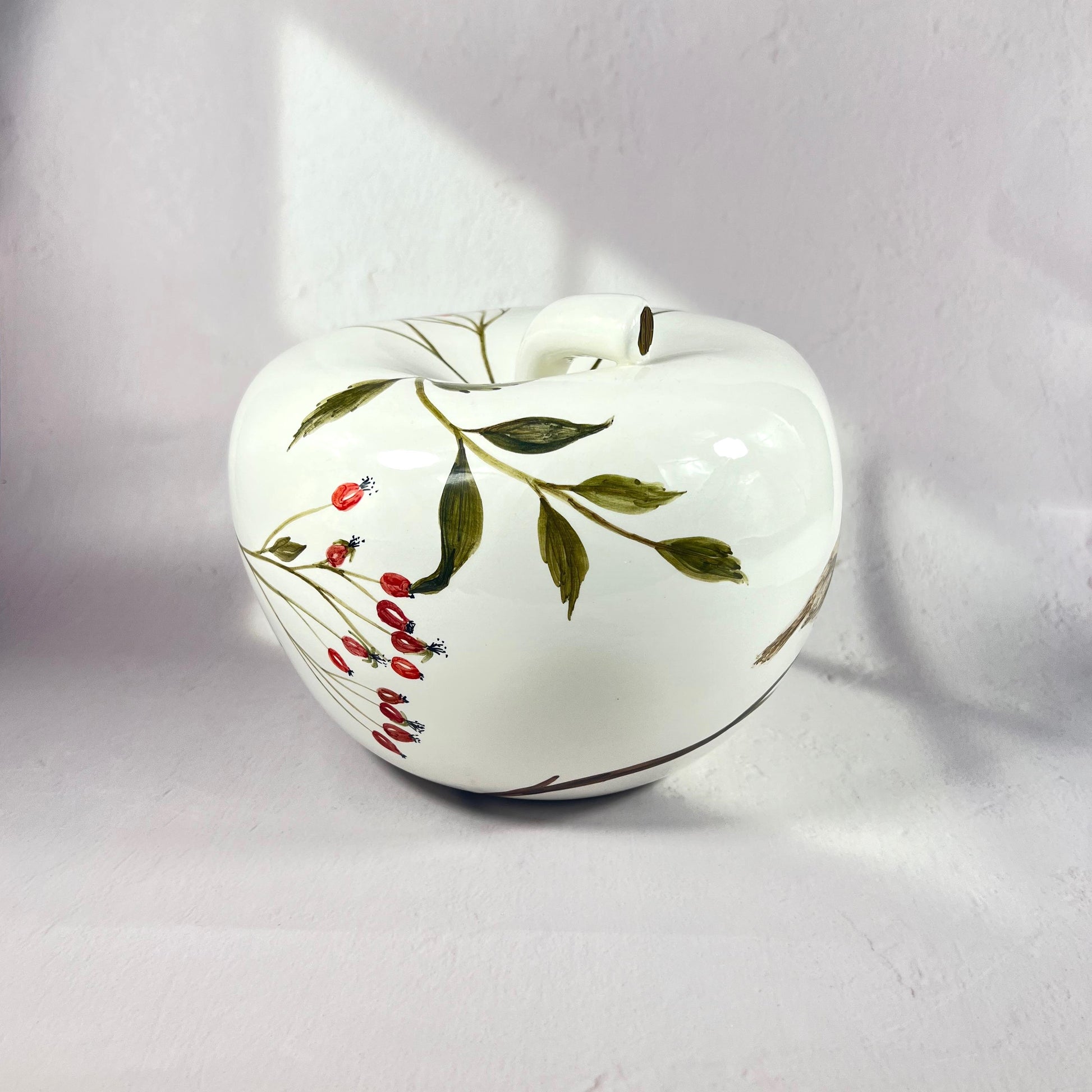 Apple-shaped moneybox with unique decorations manually made by the artist. On the product there are two holes: one for the entry of coins on the top and one for the extraction of the contents on the base. Each piece is signed by the artist and produced entirely in Italy. The creations of this collection are unique pieces.