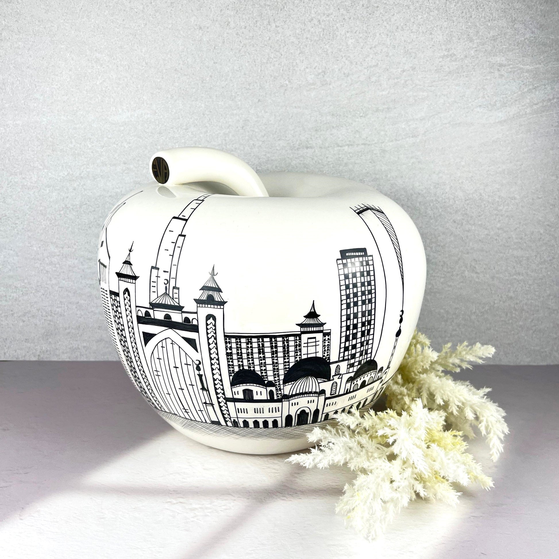 Apple-shaped moneybox with unique decorations manually made by the artist. On the product there are two holes: one for the entry of coins on the top and one for the extraction of the contents on the base. Each piece is signed by the artist and produced entirely in Italy. The creations of this collection are unique pieces.