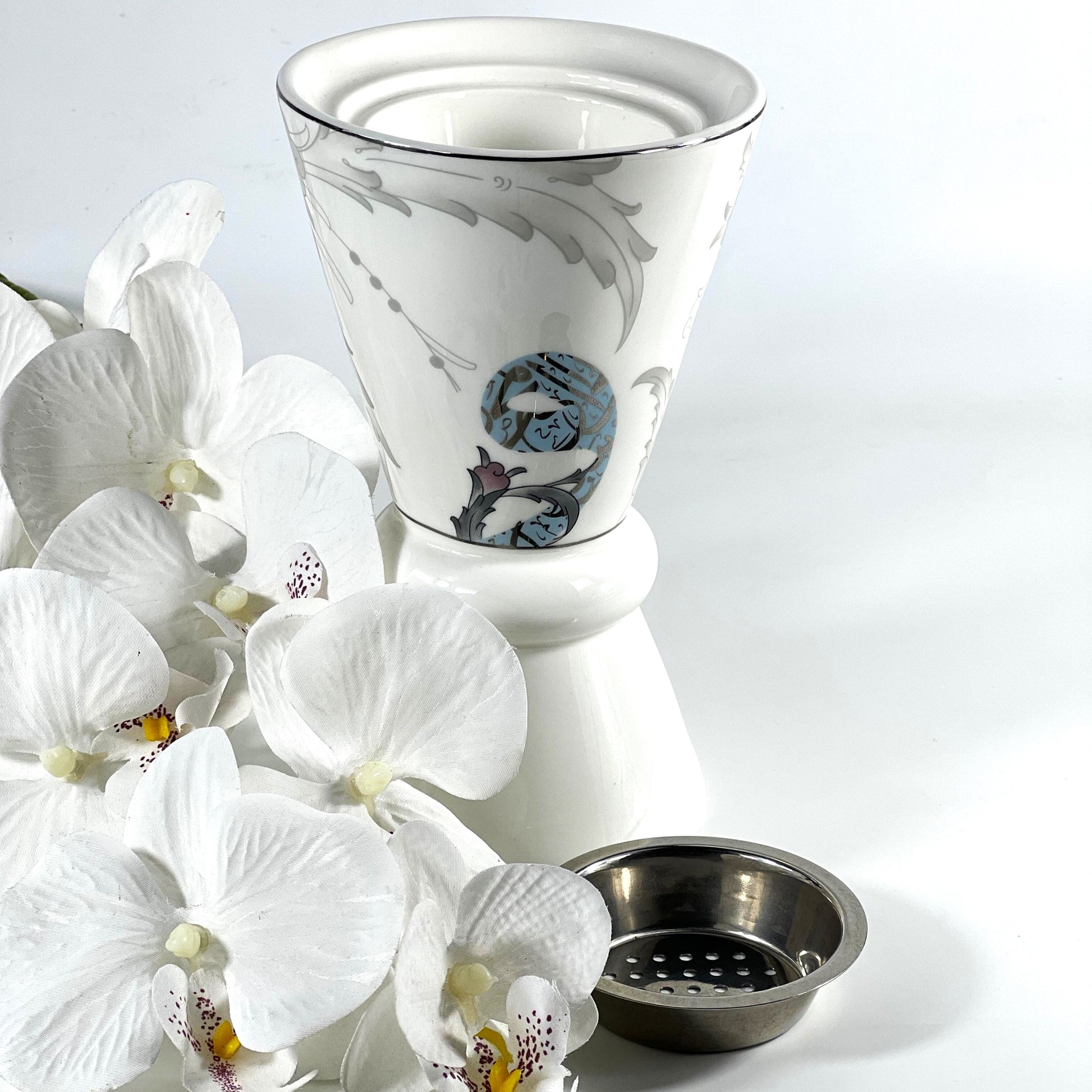 Elevate your incense rituals with the Feather Madkhan, a beautifully crafted porcelain incense burner designed to blend traditional purpose with modern elegance. Featuring delicate floral feather motifs in soft gray tones, this madkhan adds a touch of sophistication to any room or spiritual space.
