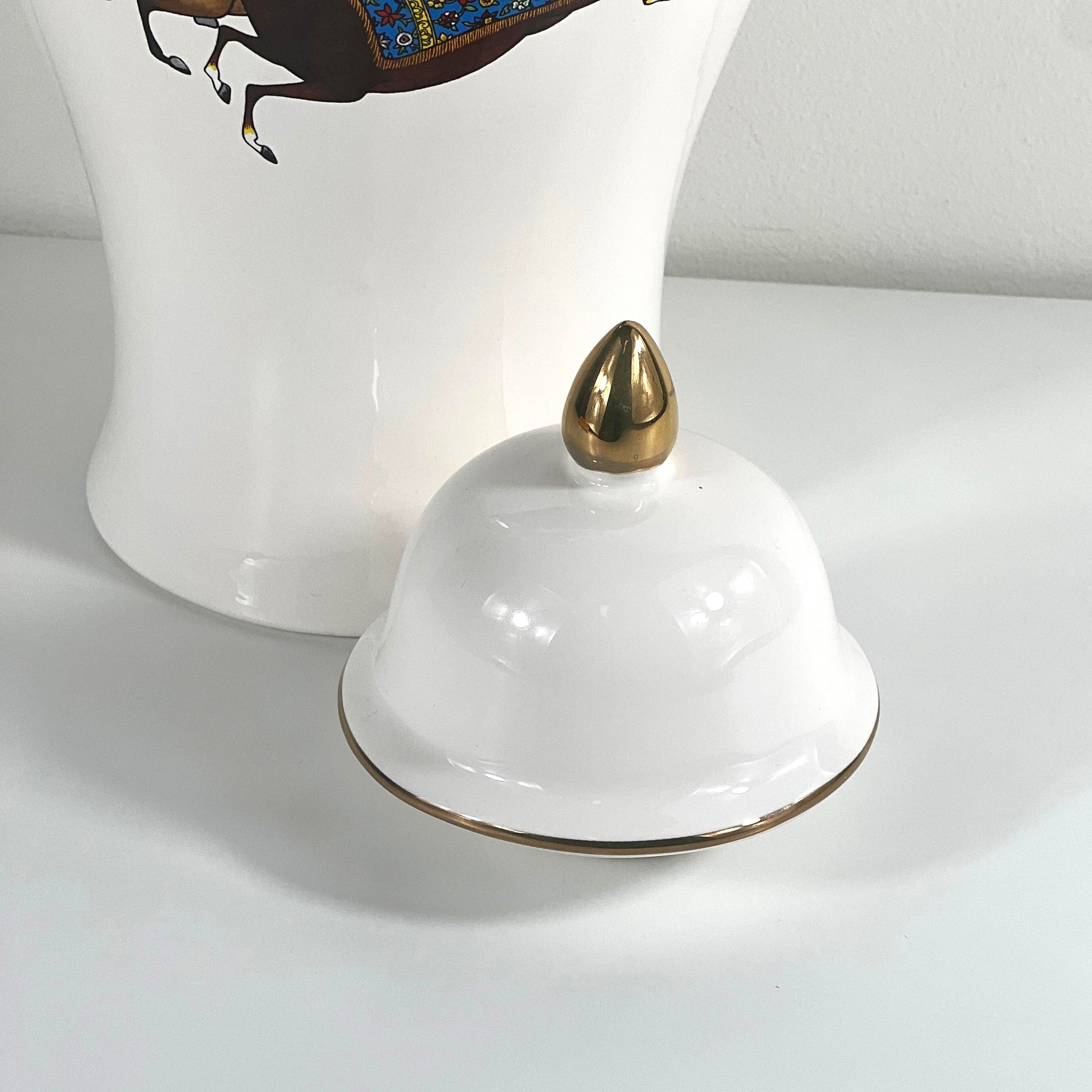 Elevate your home décor with this exquisite 45cm Gold Plated Horse Ginger Jar. Featuring an elegant white ceramic base adorned with a vibrant and intricate horse motif, this jar is a stunning blend of art and utility. The gold-plated accents on the lid and details add a luxurious touch, making it a perfect centerpiece for any room.