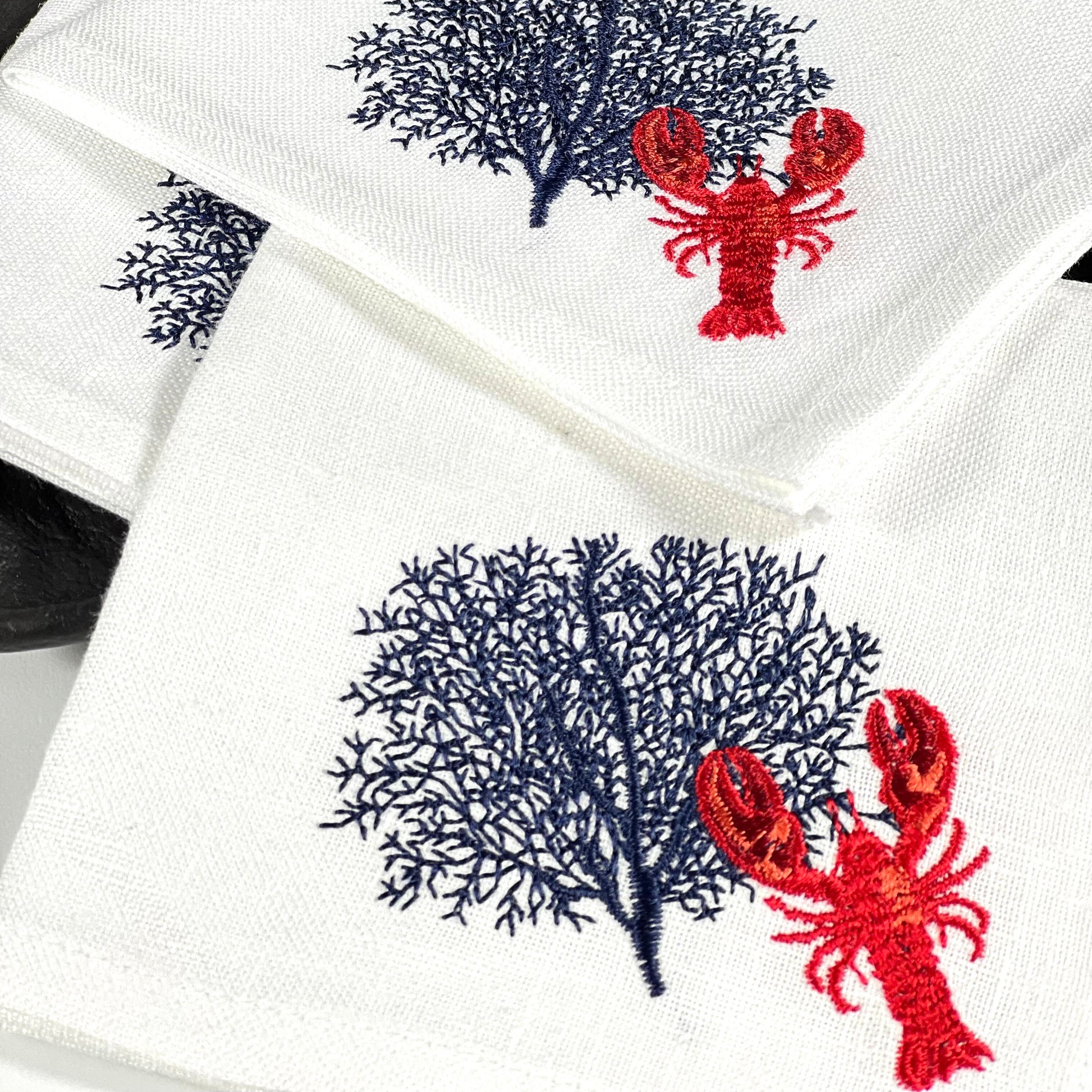 LOBSTER CORAL-WHITE LINEN COCKTAIL NAPKIN