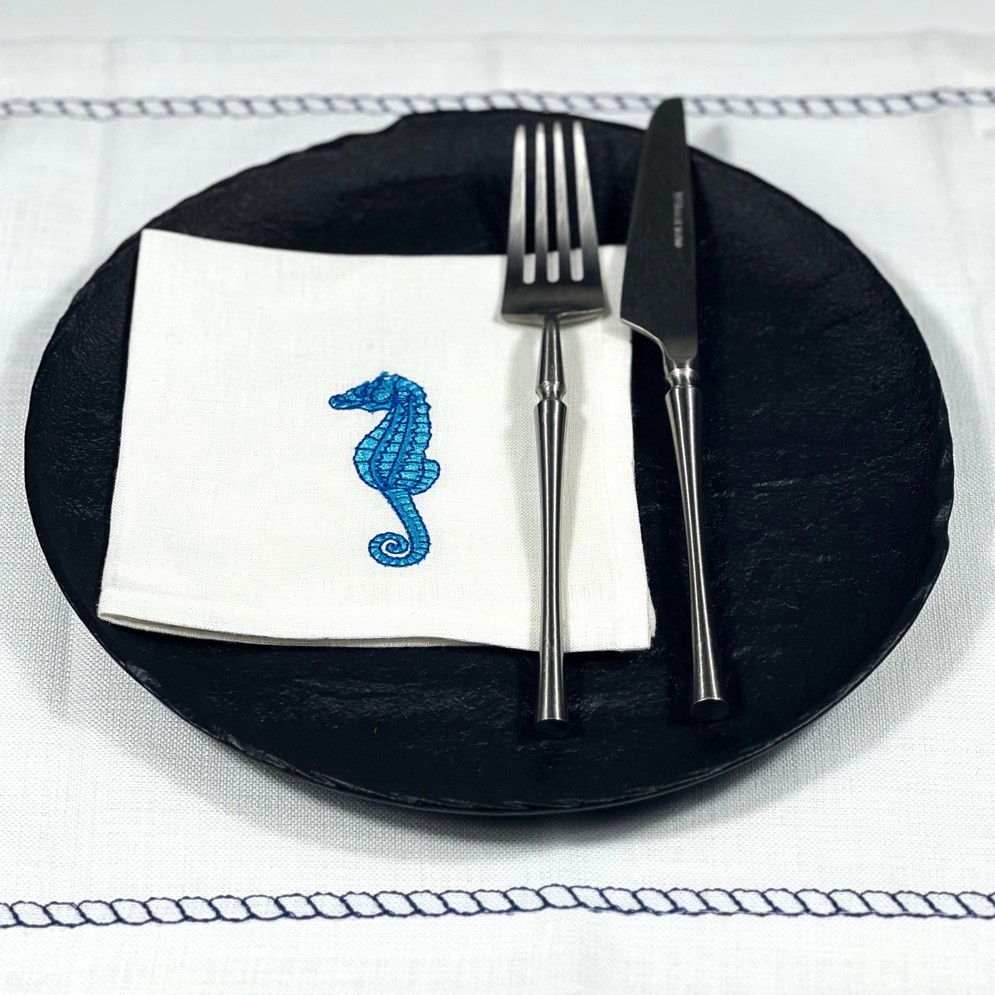 SEA HORSE TURQUOISE-WHITE LINEN COCKTAIL NAPKIN 14*14