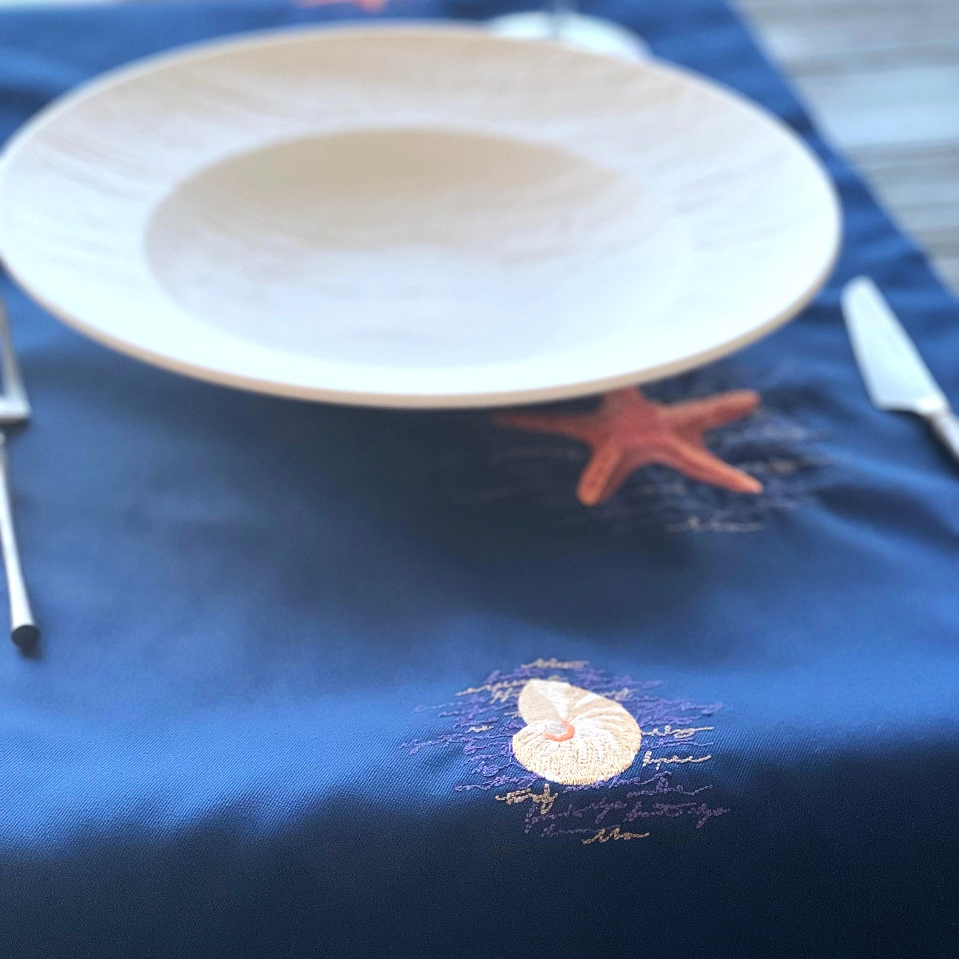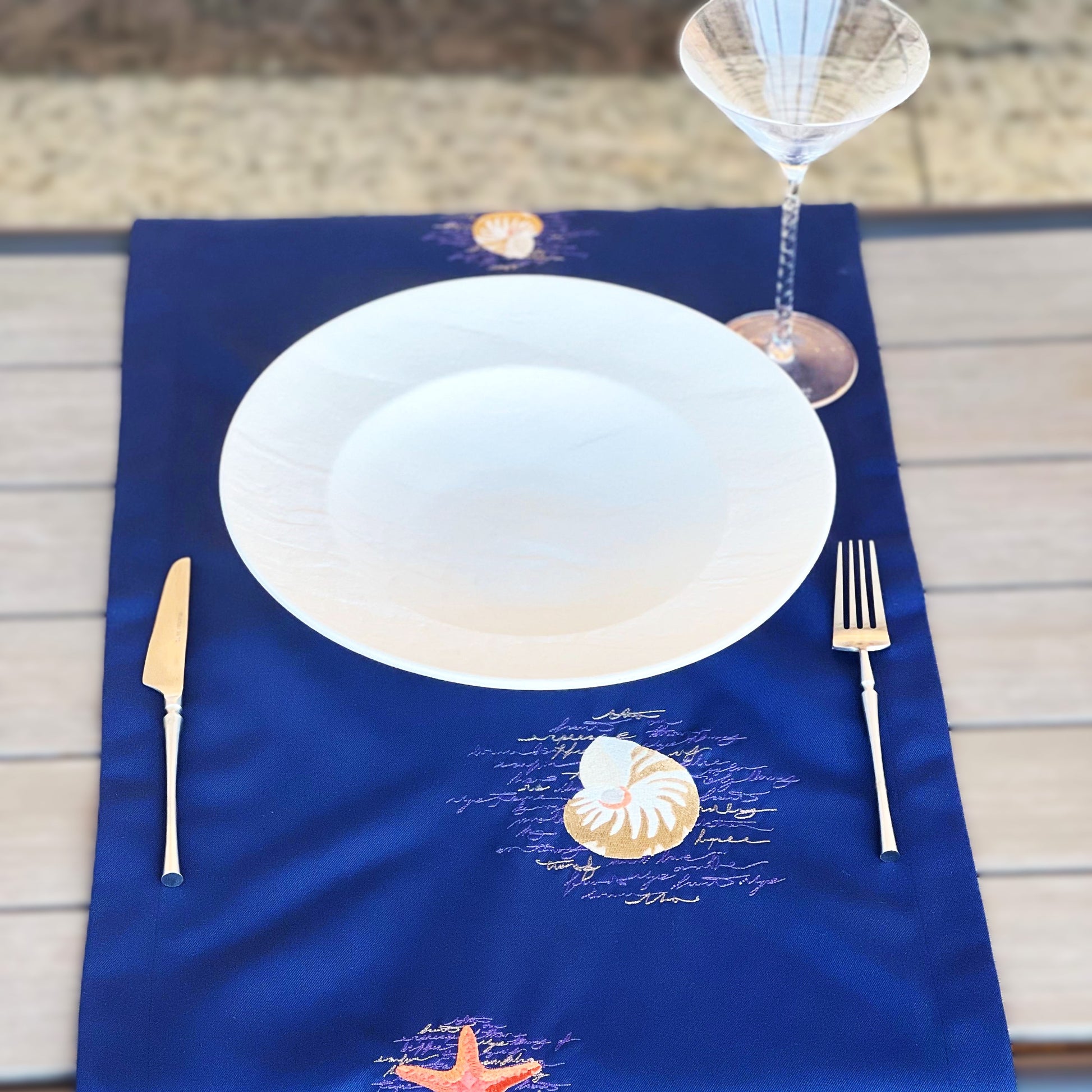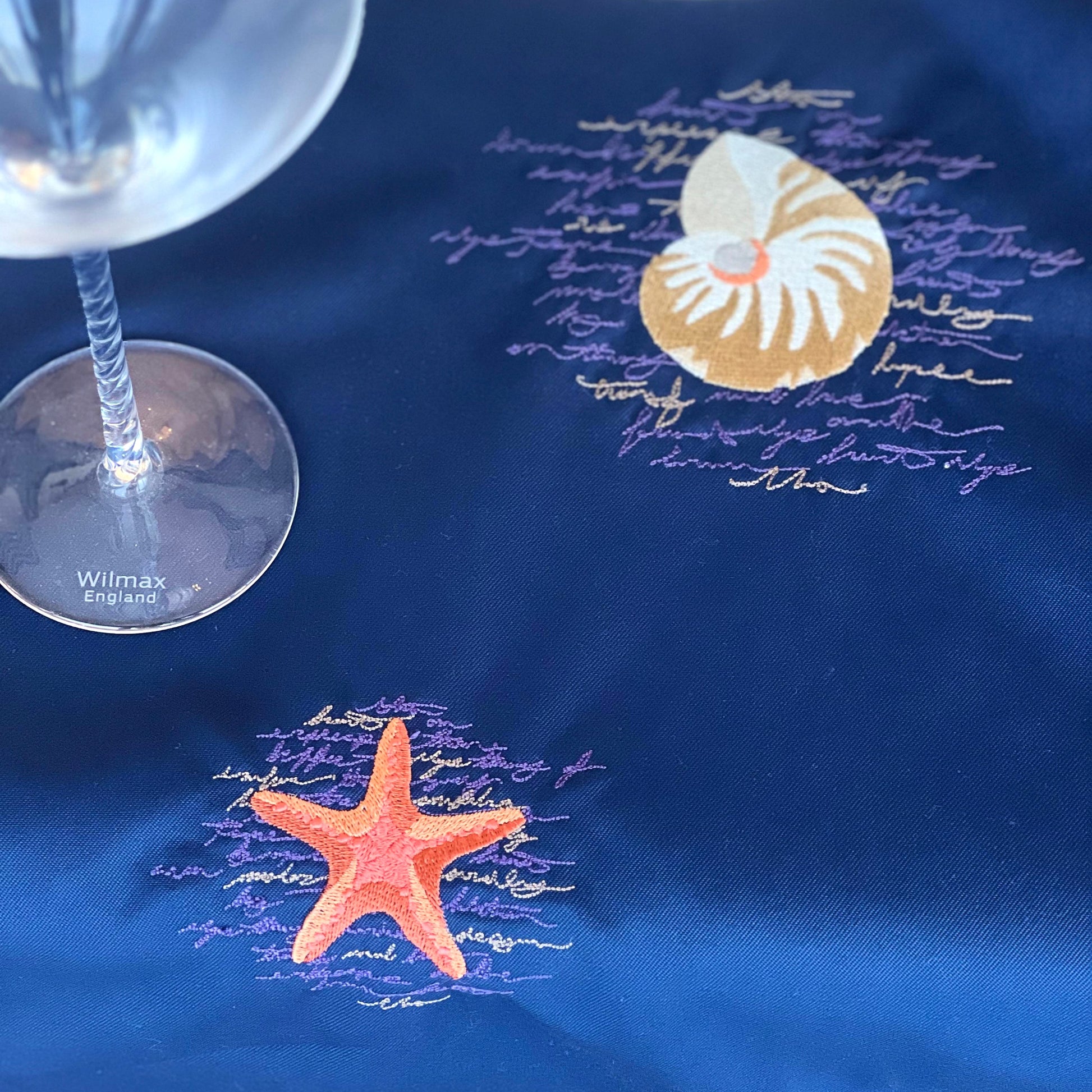 Bring a touch of coastal poetry to your home with the Starfish & Nautilus Poem Runner in rich Beta Navy. Inspired by the mysteries of the sea, this elegant table runner features intricate starfish and nautilus shell motifs alongside poetic script, all set against a deep navy background. Perfect for beach-themed décor or to add a serene oceanic vibe to any table setting.