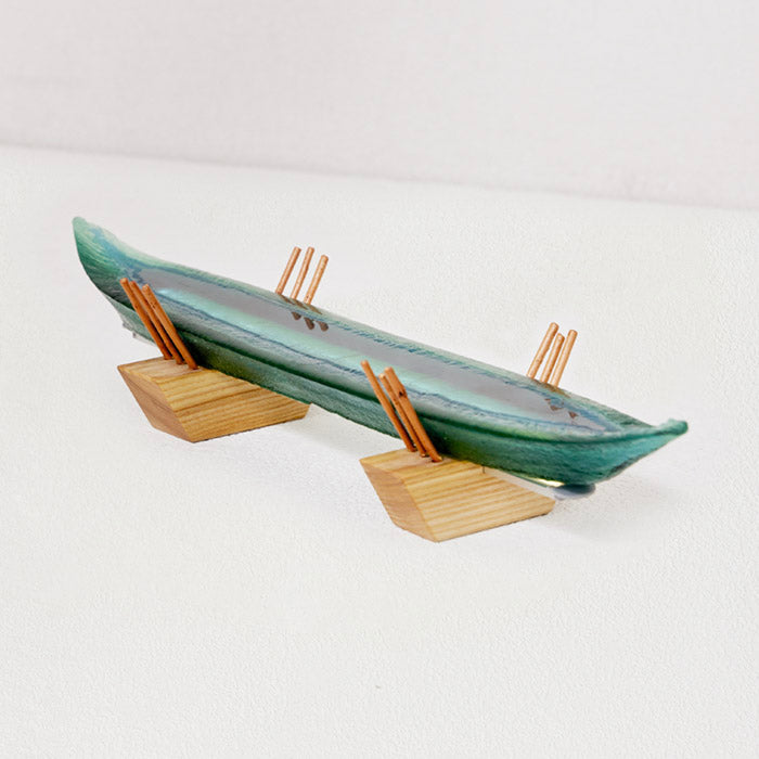 Illuminate your space with the Sushi Light, a one-of-a-kind handcrafted glass and wood sculpture that blends art with functionality. Inspired by the elegance of Japanese design, this piece features a sleek, boat-shaped glass body in a rich green hue, accented with warm wooden supports and delicate chopstick-like details.
