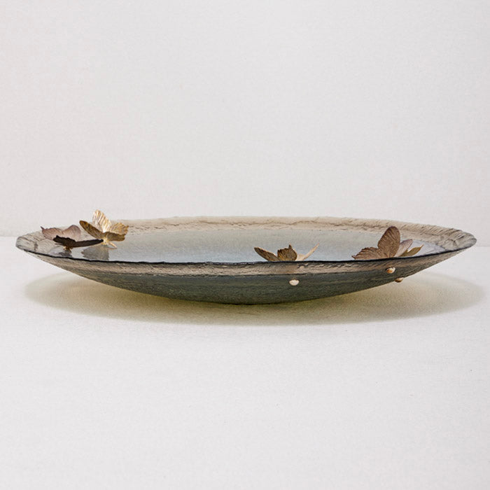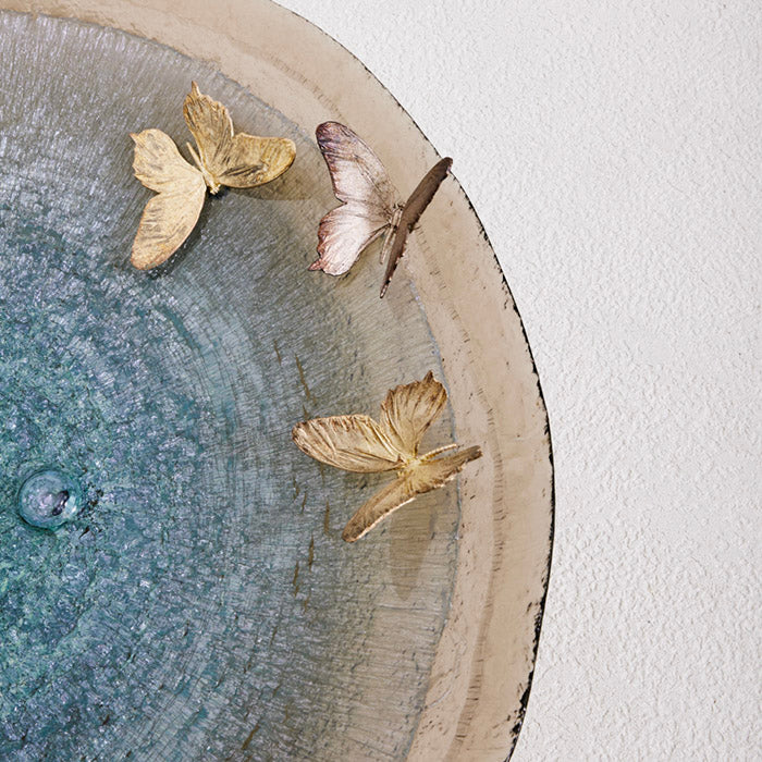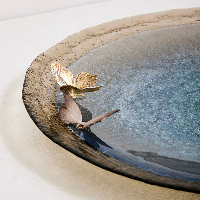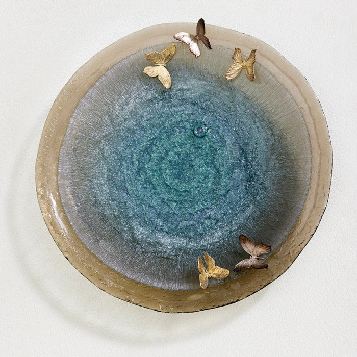 Illuminate your space with the mesmerizing beauty of UV LIGHT, a Lisowski. This circular artwork captures the essence of light and movement, featuring a textured, ripple-like center in soothing blue-green hues. A delicate gradient transitions from the luminous core to an earthy outer rim, evoking the interplay of water, light, and natural elements. Handcrafted golden butterflies add an ethereal touch, symbolizing transformation and serenity.